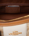 The Coach bag combines refined pebble leather with printed coated canvas and features a fabric lining. It hs a detachable canvas strap , adorned with the logo. Key features include an outside zip pocket, an inside zip pocket, and an inside multifunction pocket. The bag closes with a zip and is equipped with four protective feet at the base to keep it elevated.