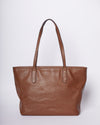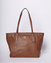 This Coach Tote, crafted in leather, features a zip closure and a single compartment with inside zip and slip pockets for organized storage. It showcases the front logo and includes dual carry handles for versatile use. The interior also has two flat pockets for additional convenience.
