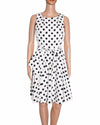 Coast Polka Dress in White is rendered in a crisp white fabric adorned with bold black polka dots. The design is defined by its flattering fit-and-flare silhouette, featuring a sleeveless bodice with a high, rounded neckline that creates a polished profile. A standout feature is the dramatic ruffled side detail, which adds a layer of asymmetrical volume and fluid movement to the skirt. Finished with a coordinated self-tie waist belt and a modest hemline.