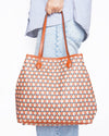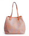 Coccinelle handbag is a vibrant and stylish accessory. The bag features a unique geometric grid pattern in a striking palette of orange, tan, and blue. The silhouette has a classic, structured tote shape with dual tan leather top handles and trim, which adds a refined contrast.