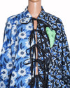 Dhruv Kapoor Two-Tone Printed Shirt is rendered in premium cotton poplin featuring a striking split-design: the right side showcases a vibrant cerulean sunflower print, while the left side transitions into a graphic black-and-blue heart motif. . A standout feature is the dramatic central tie-up detailing, featuring long, braided black tassels that provide a beautiful industrial contrast and kinetic movement. Adding to its whimsical character is a detachable lime-green textured heart brooch, a definitive house hallmark that provides a pop of neon brilliance. Finished with balloon-style sleeves and side-tie cuffs.