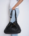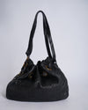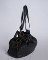 Dior Black Cannage Leather Drawstring Bag is a stylish and soft luxury piece. The bag is crafted from supple black leather and features the brand's iconic Cannage quilting across the body, giving it a timeless, recognizable texture. The silhouette is a relaxed, drawstring bucket style. The design is accented with striking antique gold-toned hardware, including large grommets at the opening, a bold hook detail, and the signature dangling D.I.O.R. charms.