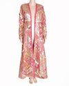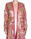 Divya Seth Embroidered Jacket is a stunning and vibrant piece, perfect for festive or wedding wear. The ensemble features a long, open-front jacket crafted in a rich palette of red, orange, and gold tones. The exterior is lavishly adorned with intricate, densely packed embroidery and gota patti work, forming sophisticated geometric patterns that shimmer brilliantly.