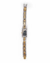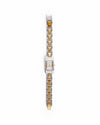 DKNY Women's Two-Toned Bracelet Band Watch is rendered in a premium combination of silver and gold-toned stainless steel. The design is defined by its unique "H-link" architectural bracelet, featuring polished silver outer links that frame contrasting gold-toned central bars for a structured, modern look. A standout feature is the slim, rectangular tonneau-style case, which provides a sleek and feminine profile on the wrist while maintaining a clean, minimalist feel. Finished with a luminous white sunray dial featuring slim gold-tone hands.