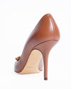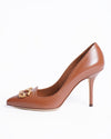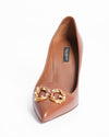 Dolce & Gabbana Amore Brown Pumps are a timeless and sophisticated footwear choice. The shoes are crafted from a soft, high-quality brown leather and feature a classic, pointed-toe silhouette and a high stiletto heel. The most prominent detail is the large, polished gold-tone 'DG' logo hardware on the front, which is adorned with subtle pearl embellishments. These pumps are a perfect accessory for adding a touch of bold glamour and brand recognition to any evening or formal outfit.