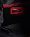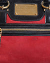 Dolce & Gabbana Miss Easy Way Boston Satchel is a statement piece that embodies the brand's maximalist aesthetic. The bag is crafted from a vibrant red suede, creating a rich texture. It is accented with a striking combination of materials, including black patent leather on the handles and trim, and gold-tone snakeskin-embossed leather on the side straps. The satchel features a structured shape, a top-zip closure, and polished gold-tone hardware, including the branded plaque on the front.