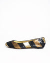 Dolce & Gabbana Footwear is meticulously crafted with a base of premium textile, entirely saturated in high-density micro-sequins for a brilliant, light-catching effect. The design is defined by its timeless round-toe ballet silhouette, offering a graceful and versatile profile that balances comfort with high-fashion impact. A standout feature is the bold striped pattern, which masterfully alternates between shimmering black, radiant gold, and metallic silver sequins in a rhythmic diagonal arrangement.