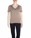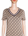 Fendi FF Brown Knitted Pullover is rendered in a premium brown jacquard knit, featuring the world-renowned "Zucca" FF monogram in an all-over repeated pattern. The design is defined by its flattering V-neckline, which is highlighted by a high-contrast ribbed trim. A standout feature is the bold varsity-style stripe detailing in brown, white, and red that borders the collar, providing a vibrant, modern pop of color against the classic tobacco-toned base. Finished with short, structured sleeves and a tailored fit.