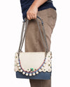 Fendi Kan I Shoulder Bagis rendered in a luxurious bi-material construction, featuring a front flap in genuine beige snakeskin and a structured base in smooth slate-blue leather. The design is defined by its iconic scalloped edges, which are further embellished with delicate laser-cut floral motifs centered with green studs. A standout feature is the signature "Rainbow" twist-lock closure, adorned with two-tone square studs in green and gold that provide a modern, graphic focal point. Finished with a sliding chunky silver-tone chain strap and a matching leather top handle with conical studs.
