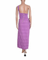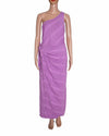 Free People Wrap Dress is rendered in a premium purple fabric, likely a high-quality linen and cotton blend. The design is defined by its unique one-shoulder or wrap-style neckline, which creates an elegant draped effect across the upper profile. A standout feature is the detailed back construction, featuring a smocked elasticated panel for a comfortable, custom fit and a row of decorative vertical buttons that add a touch of artisanal charm. Finished with delicate tie-up shoulder straps and a fluid, midi-length skirt.