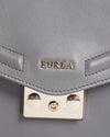Furla Alice Shoulder Bag is defined by its sharp, structured silhouette and distinctive flap detailing. Crafted from smooth, high-quality leather in a versatile Grey hue, the bag features a geometric envelope-style flap accented by a practical zip pocket. The flap is secured by a signature gold-tone twist-lock closure. With both a top handle and a detachable shoulder strap.