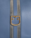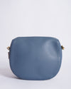 Furla Gioia Crossbody Bag. This elegant, rounded bag is crafted from beautiful pebbled leather in a blue hue, accented with contrasting vertical stripes down the center for a sporty yet sophisticated touch. The front is adorned with a polished gold-tone buckle featuring the Furla arch logo, adding a signature detail. With its versatile and adjustable wide Crossbody fabric strap