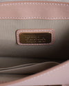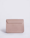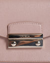 Furla Julia Mini Crossbody Bag. This elegant compact bag is crafted from beautiful leather in a soft, versatile blush pink hue. It features a sleek rectangular silhouette with a classic flap closure, secured by a polished gold-tone push-lock bearing the Furla logo.