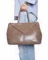 Furla Kelis Tote is expertly crafted from premium taupe leather, offering a supple feel and a subtle, sophisticated sheen. The design is defined by its innovative envelope-style front flap, which features clean diagonal stitching and a polished silver-tone metal edge for a sharp, geometric finish. The tote features a spacious, structured body with dual slender top handles, ensuring a comfortable carry for daily essentials.