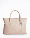 Furla Leather Shoulder Bag is a timeless and versatile accessory. The bag is crafted from a supple, light pink leather, giving it a soft and feminine feel. It features a sleek, minimalist silhouette with a comfortable single shoulder strap and a secure top-zip closure. The bag is accented with polished gold-tone hardware, including the signature Furla logo plaque on the front.