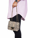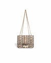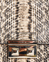 Furla Metropolis Snakeskin-Embossed Leather Shoulder Bag is rendered in premium calf leather with a sophisticated tonal snakeskin embossing, featuring a sophisticated monochromatic python print in shades of cream, sand, and black. A standout feature is the signature oversized polished gold-tone push-lock closure a definitive mark of archival Furla luxury that captures the light with brilliant luster and anchors the design with modern elegance. Finished with a slender gold-link chain strap.