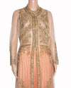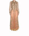 Geisha Designs Lehenga with Sheer Long Top is rendered in a radiant sunset orange. The design is defined by its contemporary layering, featuring a floor-length flared lehenga skirt paired with a unique, longline sheer overlay. A standout feature is the elaborate gold and silver embroidery that adorns the sheer top, concentrated along the front panels, cuffs, and hemline in a series of scrolling vine and floral motifs.