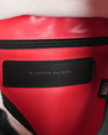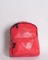 A vibrant red backpack featuring the Gigi Znotti logo on the front, a zip pocket inside, a zip pouch attached to the front, and a compartment with multiple zip pockets.