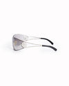 Givenchy Silver Frame Sunglasses is rendered in a high-shine silver-tone metal. The design is defined by its oversized, wrap-around shield lenses, which provide a seamless and bold profile while offering comprehensive eye protection. A standout feature is the minimalist metallic hardware, including a slender bridge and integrated hinges that emphasize the fluid lines of the eyewear. Finished with tapered black acetate ear tips for enhanced comfort and a secure fit.