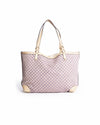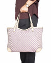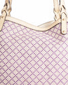 Gucci Beige/Purple Diamante Canvas Craft Original Tote Bag is rendered in premium woven canvas featuring a distinctive purple diamante geometric print set against a neutral beige background. A standout feature is the natural vachetta leather trim, which includes reinforced corner patches and elongated shoulder straps that are designed to age beautifully into a rich honey-toned patina. Finished with polished pale gold-tone hardware and a secure snap-hook closure.