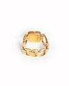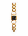 Gucci Diamond Dial Quartz Watch is rendered in premium gold-plated stainless steel. The design is defined by its square-shaped case with rounded corners, creating a bold yet feminine profile on the wrist. A standout feature is the minimalist dark sunray dial, which is elegantly accented with three sparkling diamond hour markers and the iconic "GUCCI" logo. Finished with a coordinated gold-plated link bracelet featuring open geometric cut-outs and a secure jewelry-style clasp.