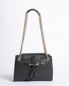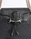 Gucci Emily Shoulder Bag is crafted in luxurious black Guccissima embossed leather, showcasing the brand’s iconic interlocking GG pattern. It features a signature horsebit detail with leather tassels on the front flap, along with a polished gold-tone chain shoulder strap that adds a sophisticated edge. The compact yet functional interior makes it ideal for day-to-night styling, combining classic design with timeless Italian craftsmanship.