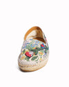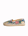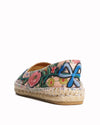 Gucci Espadrilles are meticulously crafted from a premium multicolor, featuring an all-over botanical print of delicate wildflowers in shades of crimson, sky blue, and marigold. The design is defined by its rich three-dimensional floral embroidery, where hand-applied thread-work creates textured blooms and verdant green vines that wrap across the toe and heel. A standout feature is the traditional braided jute midsole, which provides a rugged, organic contrast to the refined textile upper.