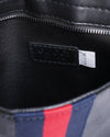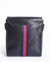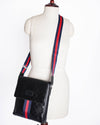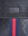 Gucci messenger bag is a versatile and stylish accessory for everyday use. The bag features the brand's iconic black GG monogram debossed on the leather, a subtle yet unmistakable nod to Gucci's heritage. The standout detail is the adjustable blue and red Web stripe canvas strap, a signature of the brand that adds a sporty and recognizable touch. The bag has a fold-over flap closure and a spacious interior, making it practical for carrying daily essentials.