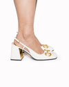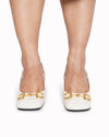 Gucci Horsebit Slingback Block Heels in White are rendered in premium smooth white leather. A standout feature is the iconic gold-tone Horsebit hardware positioned across the square toe, serving as a definitive mark of Gucci's equestrian heritage. Finished with delicate adjustable slingback straps and a subtle padded insole.