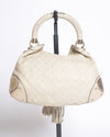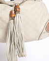 The Gucci Indy Large Guccissima Shoulder Bag is a luxurious statement piece, blending iconic Italian craftsmanship with bold design. This bag features distinctive silver-tone metal corners and bamboo hardware accents that nod to Gucci's heritage. With its flowing leather tassels, structured curved shape, and spacious interior, the Indy bag effortlessly combines elegance with functionality, making it a perfect accessory for both casual and elevated looks.
