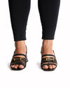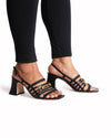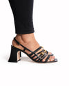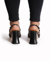 Gucci Leather Block Heels in Black are rendered in premium black leather. The design is defined by its contemporary square toe, iconic gold-tone Horsebit hardware elegantly integrated into the braided front strap, serving as a definitive hallmark of Gucci luxury. Finished with a sturdy, flared block heel and a delicate adjustable ankle strap with a gold-finish buckle.