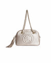 Gucci Soho Metallic Chain Shoulder Bag, this bag is meticulously crafted from premium metallic pebbled leather in a sophisticated champagne-gold hue. The design is anchored by the iconic stitched interlocking GG disco logo at the center, a hallmark of the celebrated Soho collection.