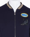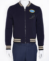 Gucci Navy Blue Shark Patch Jacket is a bold statement piece that blends classic style with playful, contemporary design. The jacket is crafted from a high-quality navy blue in a varsity-style silhouette. It features a zip-up front and ribbed trim on the collar, cuffs, and hem. The most distinctive detail is the large, colorful shark patch on the front, which adds a whimsical and artistic flair. A subtle "GUCCI" branded detail on the chest adds a touch of signature luxury.