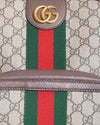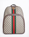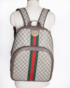 Gucci Ophidia Medium Backpack, seamlessly blending heritage elements with modern functionality. The backpack is crafted from the signature Beige GG Supreme Monogram Canvas and trimmed with rich Brown Leather. The design is boldly defined by the central Green and Red Web Stripe detail running vertically down the body and the large front pocket. It is crowned with the prominent, polished Gold-Toned Double G Logo plaque.