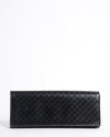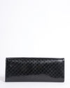 Golden Gucci Patent Guccissima Broadway Bag features a long, rectangular silhouette crafted from glossy black patent leather, embossed with the brand’s signature Guccissima GG monogram pattern. The classic fold-over flap design offers a sleek and elegant way to carry your evening essentials. This clutch combines luxury with practicality, perfect for sophisticated occasions.