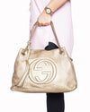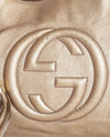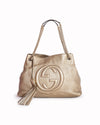 Gucci Soho Tassel Hobo Bag is rendered in a luxurious gold-tone metallic pebbled leather. The design is defined by the prominent, quilted interlocking G logo centrally embossed on the front, serving as a definitive hallmark of Gucci's heritage. A standout feature is the oversized leather tassel charm attached to the strap, which adds a playful, bohemian touch to the structured pebbled leather. Finished with pale gold-tone chain-link shoulder straps.