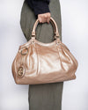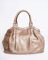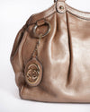 Gucci Sukey Handbag, a timeless accessory known for its soft silhouette and signature hardware. The bag is crafted from supple, luxurious Metallic Gold Pebbled Leather, which offers a beautiful, slightly slouchy drape. The silhouette is a dome or bowler style, defined by pleated/gathered detailing near the top. It features dual rolled top handles and is accented with polished gold-toned hardware, including a distinctive hanging circular charm with the interlocking GG logo.