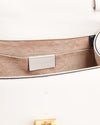 The Gucci Sylvie Leather Top Handle Bag in White is a sophisticated blend of classic elegance and modern design. Crafted from luxurious leather, it features a distinctive tri-color ribbon detail and a sleek lock closure that adds a signature touch. The bag includes two detachable crossbody slings, offering versatile styling options, while the golden hardware enhances its refined and polished look perfect for elevating any outfit.