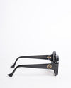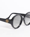 Add a bold touch to your look with these Gucci Women's Round Sunglasses in Black. Featuring oversized circular frames and gradient lenses and gold tone interloging GG logo on both side, they offer both UV protection and iconic style. Complete with the signature Gucci logo on the arms and a protective branded case, these sunglasses are the perfect mix of fashion and function.
