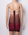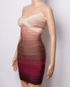 This Herve Leger bandage dress is sleeveless and showcases a striking ombre effect in shades of cream, pink, brown, and burgundy. Crafted from multicolor rayon, the dress is designed to sculpt and flatter the body, highlighting every curve. The dress features crisscrossing strips on the chest, adding a distinctive and stylish detail.
