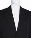 Huemn blazer is a fantastic example of the brand's sharp, minimalist, androgynous aesthetic. This unisex blazer is a classic black, with a sophisticated and structured silhouette. What sets it apart is the prominent wide, sharp lapel, which gives it a modern, architectural feel. The blazer has a double-breasted closure and a relaxed fit, making it a versatile layering piece.