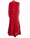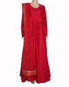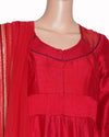 Jade Red Anarkali Set is a stunning ensemble perfect for special occasions. The set includes a beautiful red anarkali suit, featuring a flowing silhouette that flares out from a fitted bodice. The design is detailed with black piping along the neckline and bodice, creating a striking contrast that adds a modern touch. The anarkali is paired with a sheer dupatta.