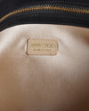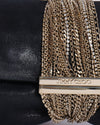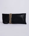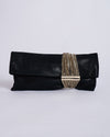 Jimmy Choo Chandra Crystal Embellished Bracelet Suede Clutch. This exquisite evening bag is crafted from luxurious black shimmering suede, featuring a sleek folded silhouette. The front is adorned with a stunning gold-tone bracelet detail, meticulously embellished with shimmering crystals, adding a touch of opulent glamour.