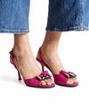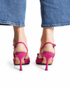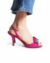 Jimmy Choo Hot Pink Ankle Strap Heels are rendered in a premium hot pink satin fabric. The design is defined by its elegant slingback silhouette, featuring a slender, adjustable ankle strap with a delicate metallic buckle for a secure and customized fit. A standout feature is the ornate crystal-embellished vamp, which boasts a large, dark rectangular gemstone flanked by shimmering clear crystals, set against a feminine fabric ruffle for added texture and drama. Finished with a classic peep-toe and a soaring stiletto heel.