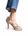 Jimmy Choo Peep Toe Pumps with Diamantes are rendered in a premium champagne-gold metallic suede, offering a subtle yet radiant shimmer that captures light beautifully for special occasions and red-carpet events. The design is defined by its sophisticated multi-strap architectural upper, which features slender, winding straps that elegantly frame the foot while providing structural support. A standout feature is the ornate diamante embellishments, which consist of three large, brilliant-cut crystals set in polished gold-tone hardware along the outer side of the vamp, adding a touch of opulent sparkle to the silhouette. Finished with a sturdy integrated platform and a towering stiletto heel.