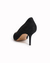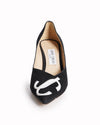 Jimmy Choo Suede Pumps in Black are rendered in premium jet-black suede. The design is defined by its sleek, pointed-toe silhouette and a flattering low-cut vamp that elongates the foot. A standout feature is the oversized "JC" monogram logo embroidered in high-contrast white on the toe of each shoe, serving as a definitive mark of the brand's luxury identity.