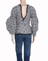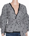 Jonathan Simkhai Wrap Top is a feminine and breezy statement piece that perfectly blends vintage-inspired charm with modern, sculptural detailing. This top is rendered in a classic black and white gingham check pattern. The design is defined by its romantic wrap silhouette, featuring extra-long fabric ties that allow for a customizable fit around the waist. A standout feature is the dramatic puff sleeves, which provide voluminous movement and a soft, airy feel. Finished with a scalloped black lace trim along the plunging V-neckline and hem.