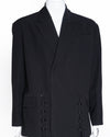 Kanika Goyal Label Plain Black Blazer is a statement of modern elegance. The blazer features a classic, tailored silhouette in a deep black hue, providing a sophisticated canvas. Its unique character comes from the prominent lace-up or tie-up detailing at the waist, which adds an edgy, contemporary twist to a classic silhouette. The structured lapels and clean lines are a hallmark of the designer's aesthetic, which is known for its fusion of traditional craftsmanship with a futuristic vision.
