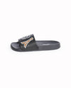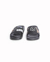 Karl Lagerfeld Zaria Sequin Logo Leather Slides are rendered in premium smooth black leather. A standout feature is the eclectic array of sequined patches hand-applied across the vamps, including an Eiffel Tower motif, the "KARL" logo, iconic sunglasses, and a stylized character silhouette. Finished with a molded tonal footbed featuring white "KARL LAGERFELD PARIS" branding.