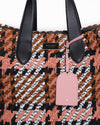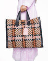 Kate Spade Large Manhattan Plaid Tote Bag features a structured rectangular silhouette crafted from woven fabric with a distinctive multi-colored houndstooth pattern in shades of brown, pink, black, and white. The bag is accented with smooth black leather handles and side panels, making it a stylish and versatile accessory for everyday use.